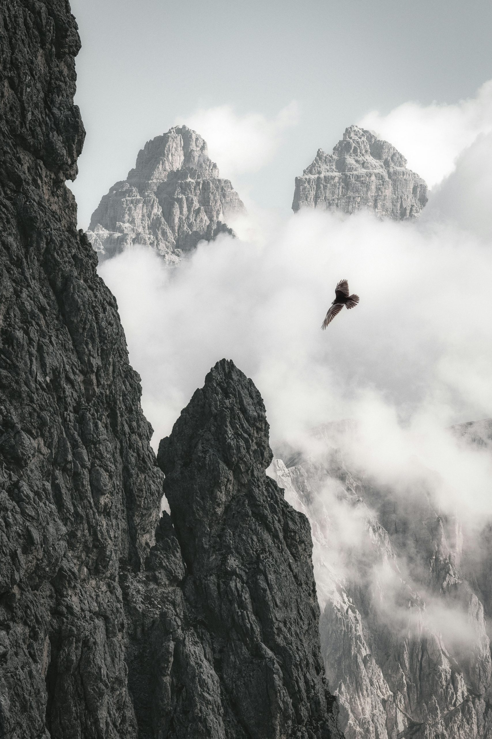 A Bird Soars Near Rocky Mountain Peaks Shrouded In Misty Clouds, Capturing Nature’s Grandeur.