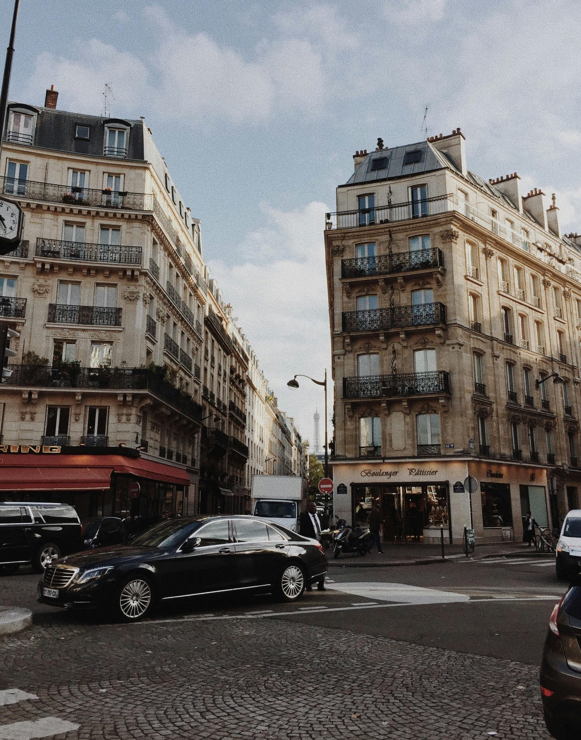 A Bustling Street Corner In Paris Featuring Classic Architecture And Urban Vibe.