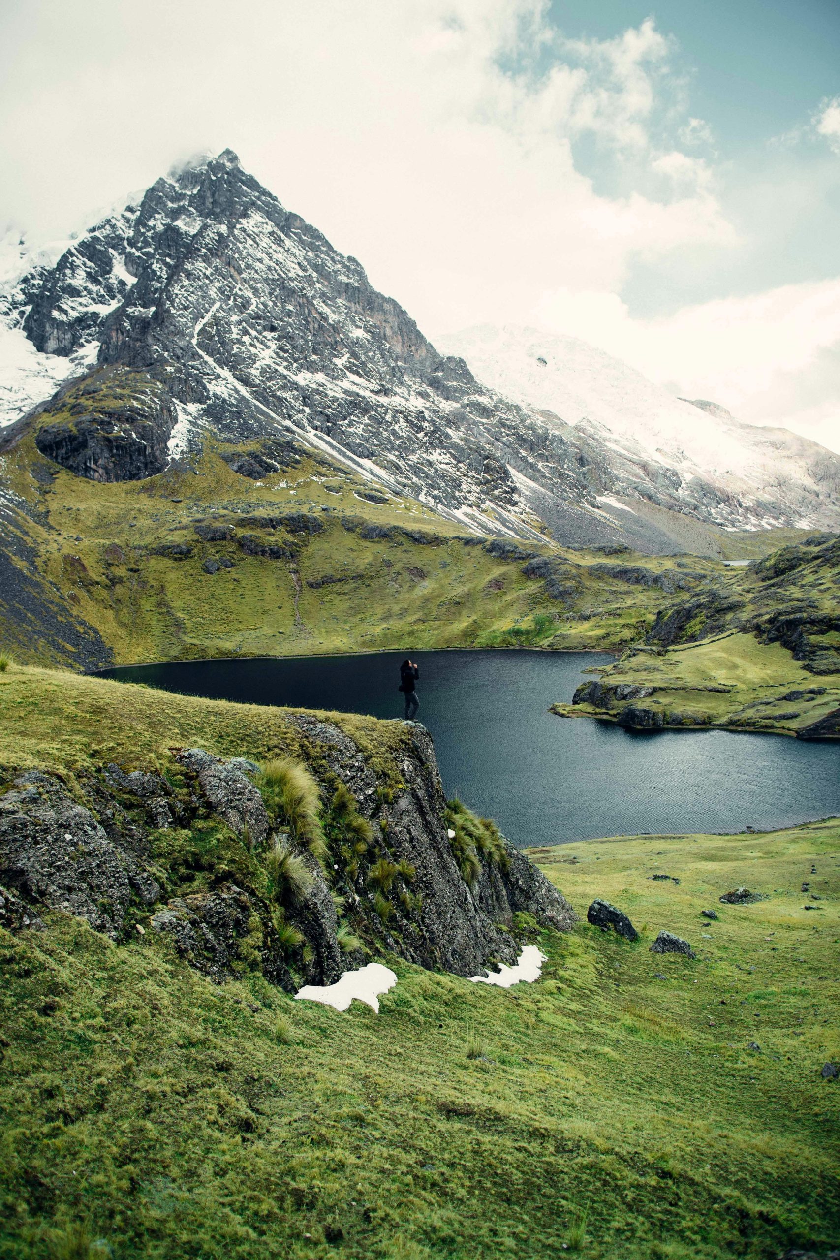 A Hiker Stands On A Cliff Overlooking A Serene Mountain Lake Surrounded By Lush Greenery And Snow Capped Peaks.