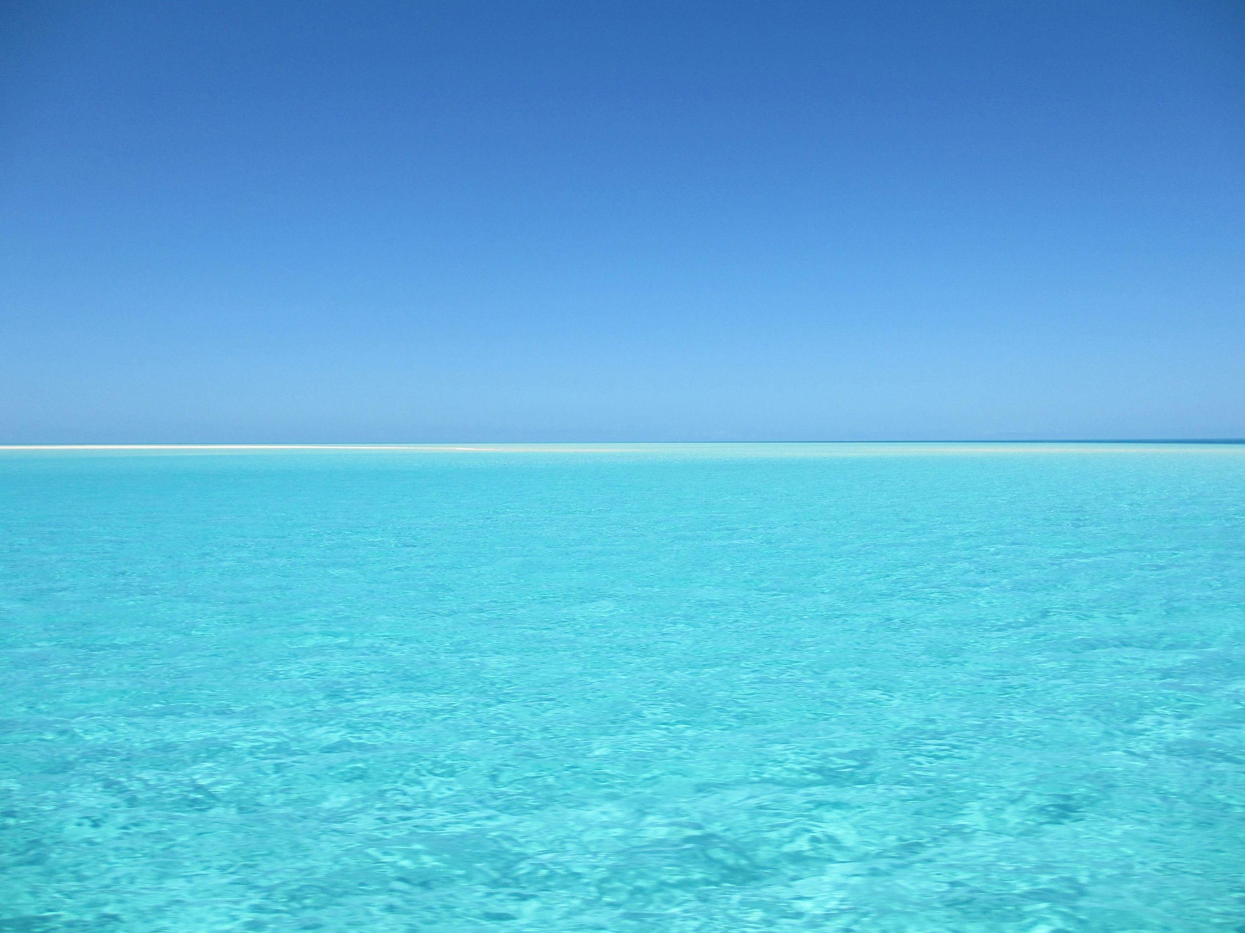 A Serene Blue Ocean With Crystal Clear Water Under A Vivid Blue Sky, Perfect For Relaxation.