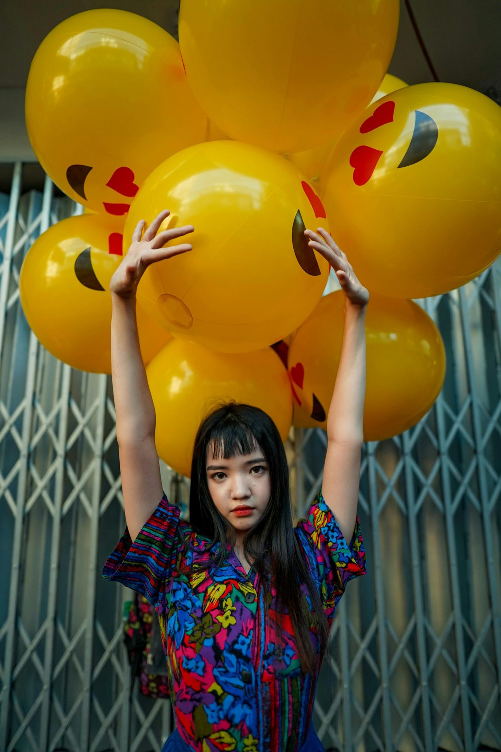 A Young Woman Poses With Bright Emoji Balloons Against An Urban Background.
