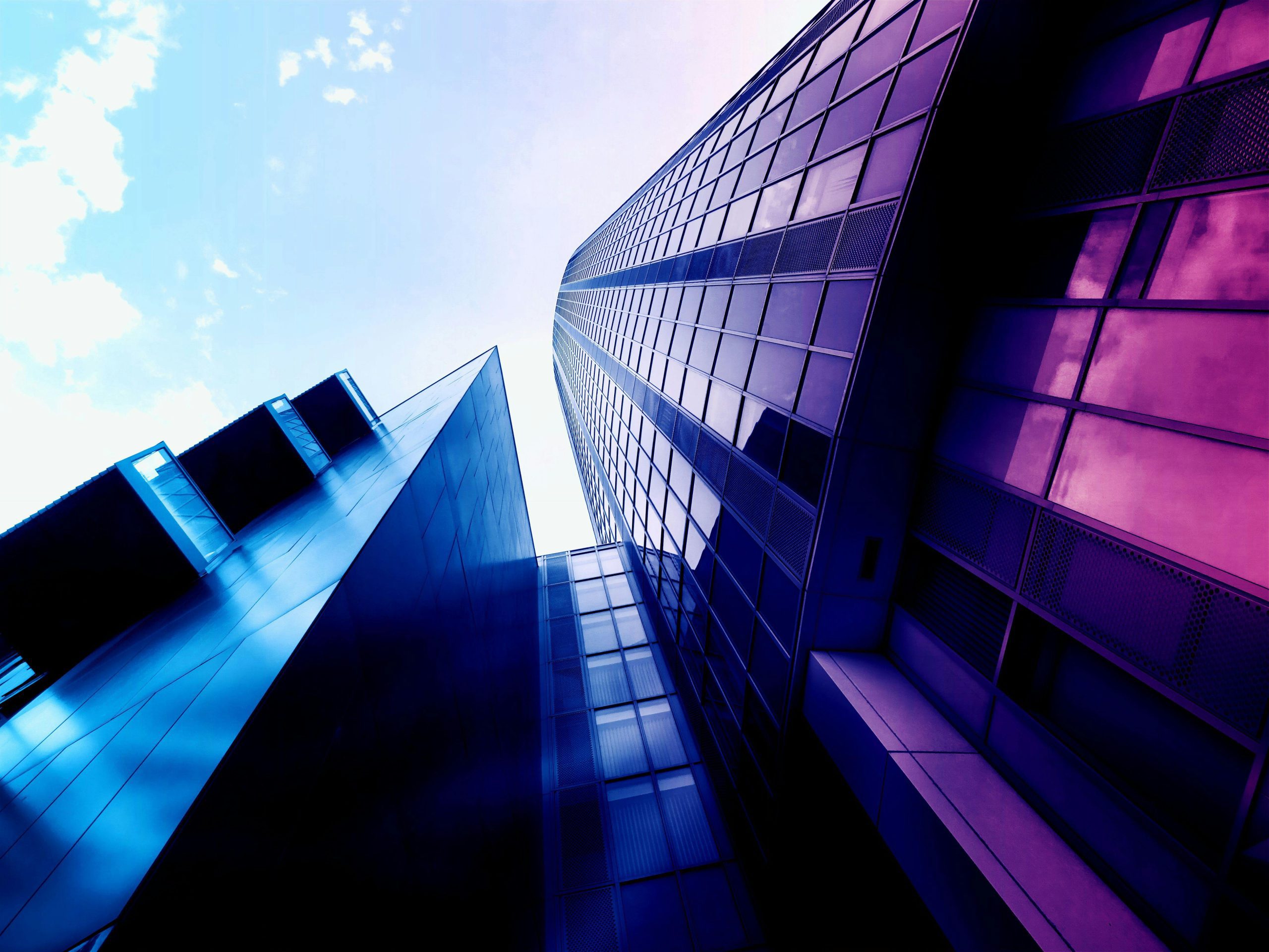 Low Angle Shot Of Modern Skyscrapers With Reflective Glass Facades And Vibrant Colors In An Urban Setting.