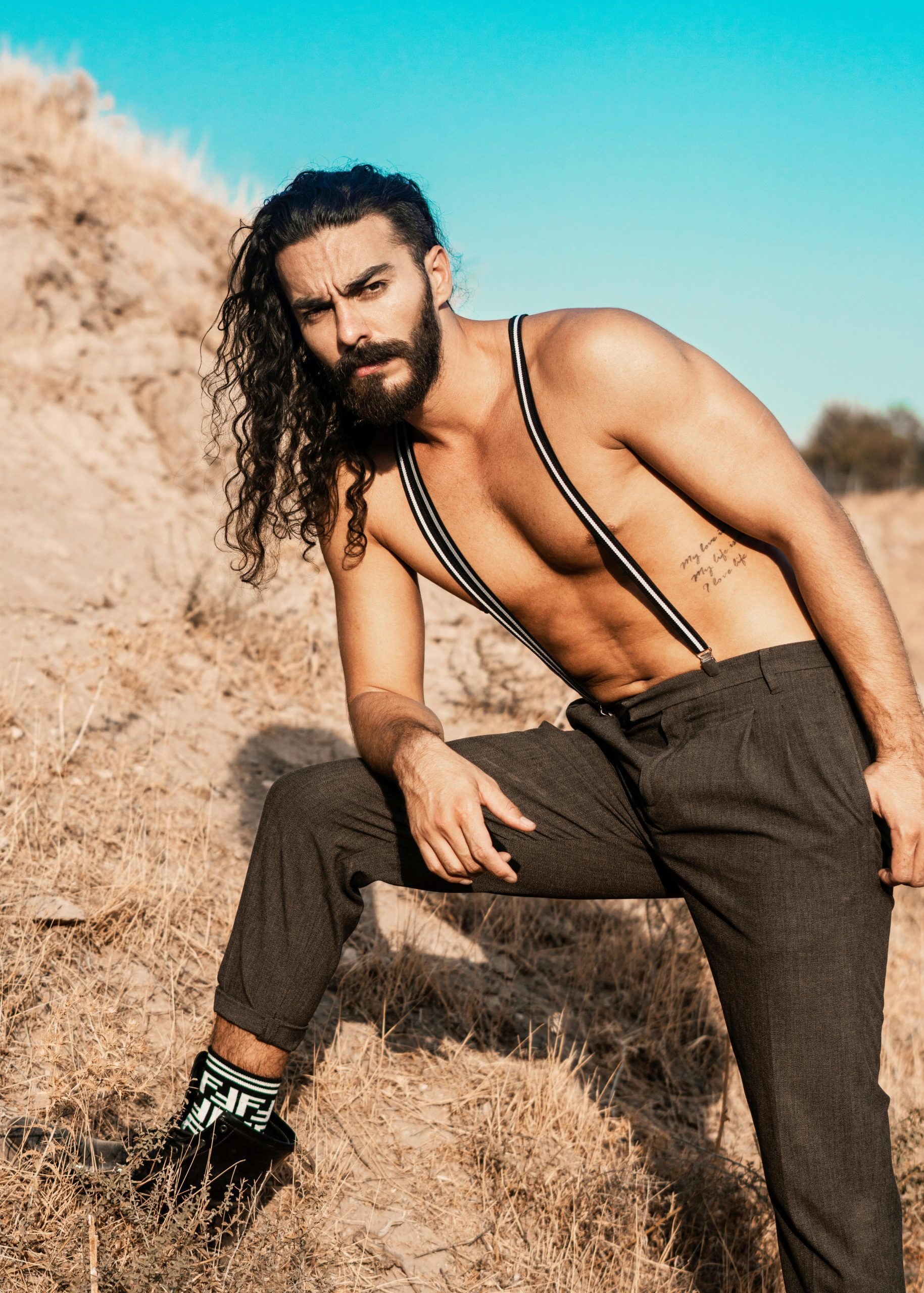 Be the first to review “Portrait Of A Shirtless Man Wearing Suspenders Posing Outdoors In Summer.”