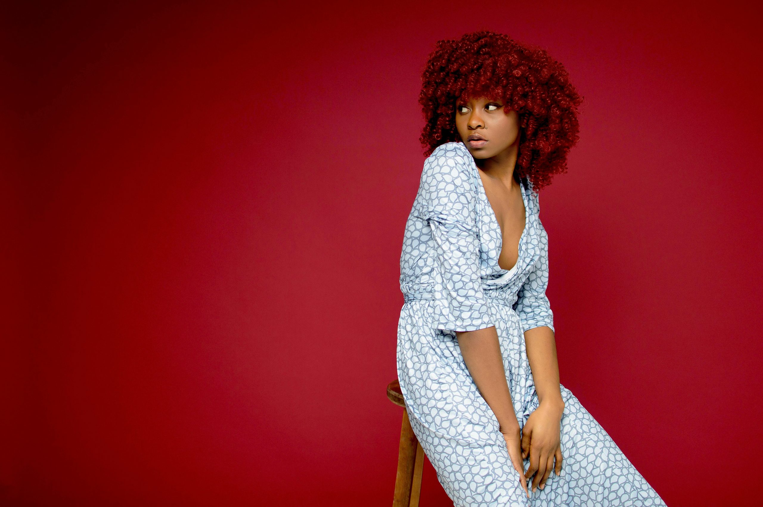 Portrait Of A Young Woman With Red Hair Sitting On A Stool Against A Red Backdrop, Showcasing Modern Fashion.