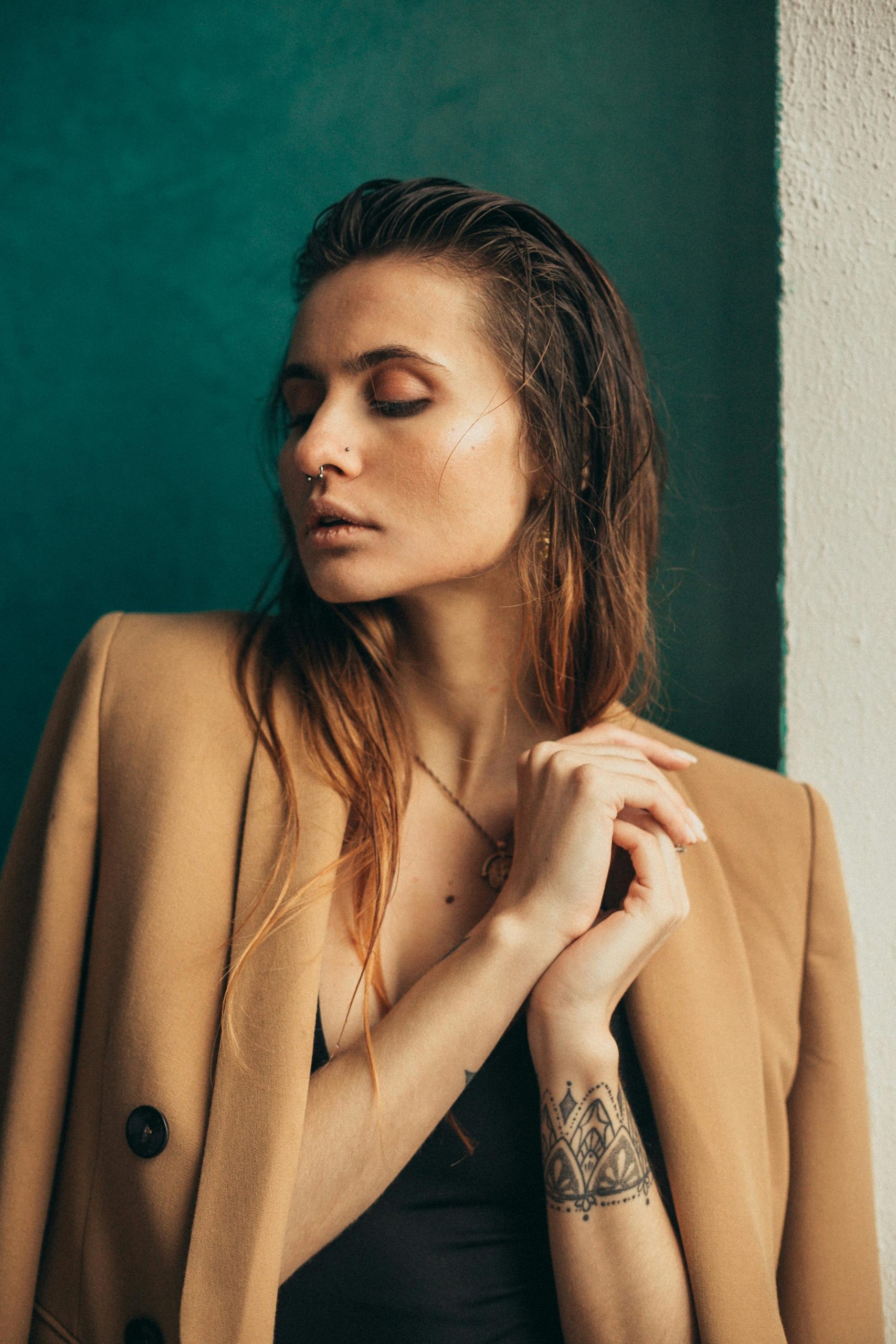 Stylish Portrait Of A Woman With A Brown Blazer And Nose Piercing, Capturing Elegance And Modern Fashion.